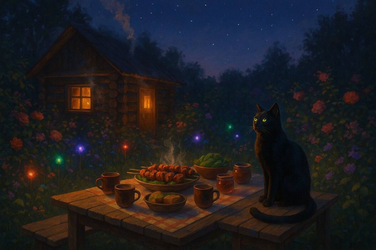 Малиновский ❤️, чёрный кот с ярко-зелёными глазами, сидел в тени и внимательно следил за происходящим. Время от времени он перемещался ближе к мангалу, проверяя уровень жара.