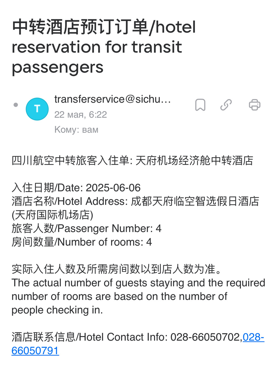 Недавно мы летели в Японию с авиакомпанией Sichuan Airlines, и у нас была стыковка около 17 часов в Китае. Авиакомпания эта предоставляет бесплатный транзитный отель на пересадке (завтрак выключен). Отель нужно бронировать по электронной почте e-bookingservice@sichuanair.com. Писать им надо на английском языке за 2-3 недели до перелета, указав номера электронных билетов для всех пассажиров. Отвечают не быстро, я ждала около 10 дней. Ответ приходит с другого ящика и выглядит так: Так вот, что же делать в Ченду на длительной пересадке? Сначала мы думали поехать в питомник панд, в которые и едет большинство транзитных туристов. Однако, по времени мы туда попадали уже после обеда, и начитавшись отзывов, что панды с обеда спят, мы решили поехать в соседний с питомником зоопарк Ченгду. Ехали на метро, станция так и называется Chengdu Zoo. От аэропорта на метро туда 1,5 часа. Вход стоит смешных денег - 20 юаней со взрослого и 10 за ребенка (220 и 110 рублей). В зоопарке есть бесплатная ка