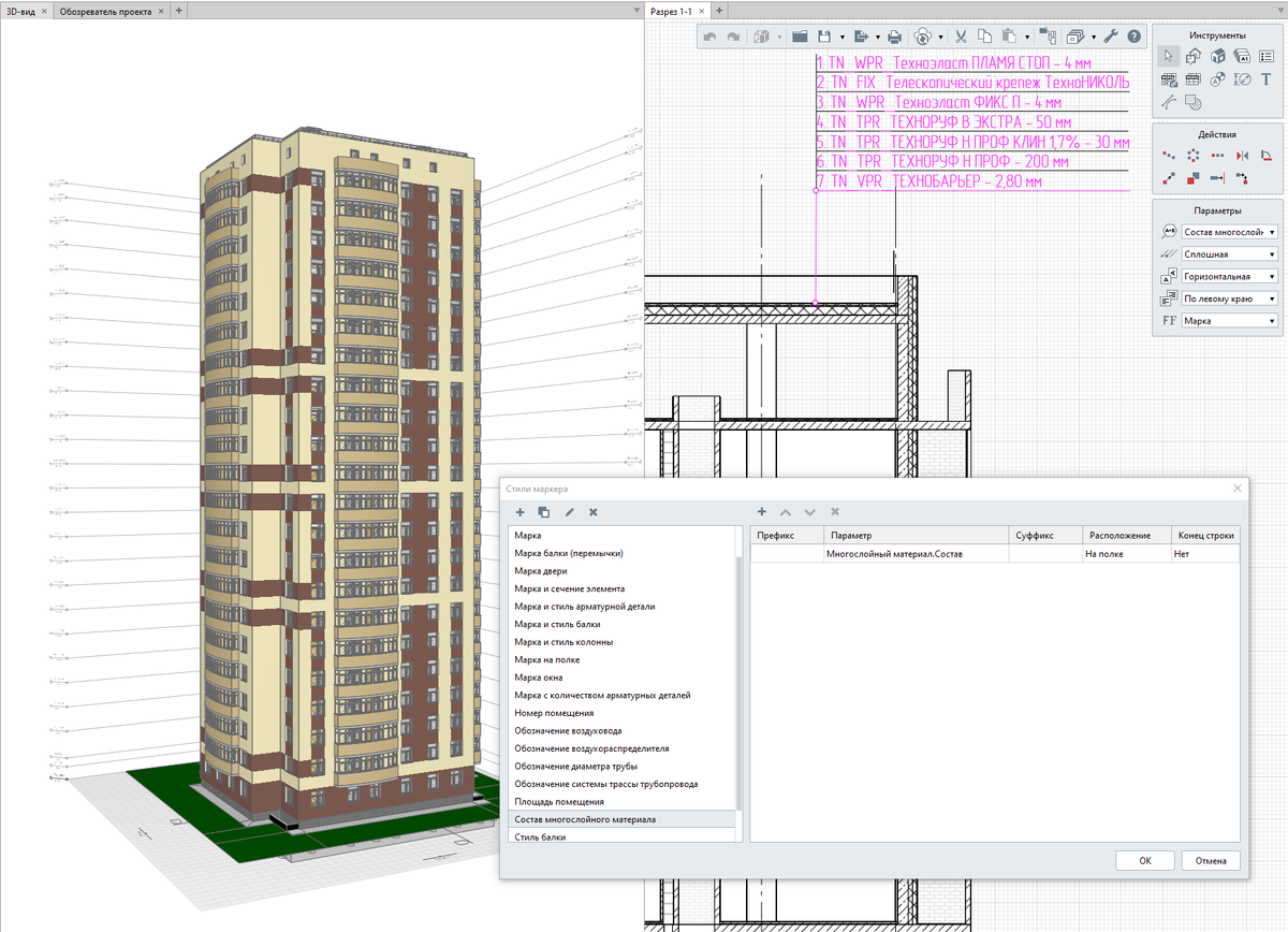 При оформлении чертежей важной частью является отображение слоёв многослойной конструкции, как правило, такие флажки показывают последовательность и толщину материалов многослойной конструкции на кровлях, наружных и внутренних стенах, перекрытиях, покрытиях. Плюсом информационного моделирования в Rengaявляется то, что такие флажки можно сформировать и вынести на чертеж автоматизированно. При изменении конструкции многослойного материала автоматически изменятся чертежи. Рассмотрим способы. 1. Для создания флажка многослойной конструкции можно создать Стиль маркера с параметром Многослойный материал.Состав и расположить его на чертеже. Дополнительные полки можно выполнить инструментом Линия. 2. Для создания флажка можно воспользоваться инструментом Легенда. Подробно описано в статье. 3. Создать флажок также можно с помощью инструмента Выносная надпись. Дополнительную информацию можно изучить в Практическом руководстве пользователя Renga. Изучайте Renga с удовольствием!