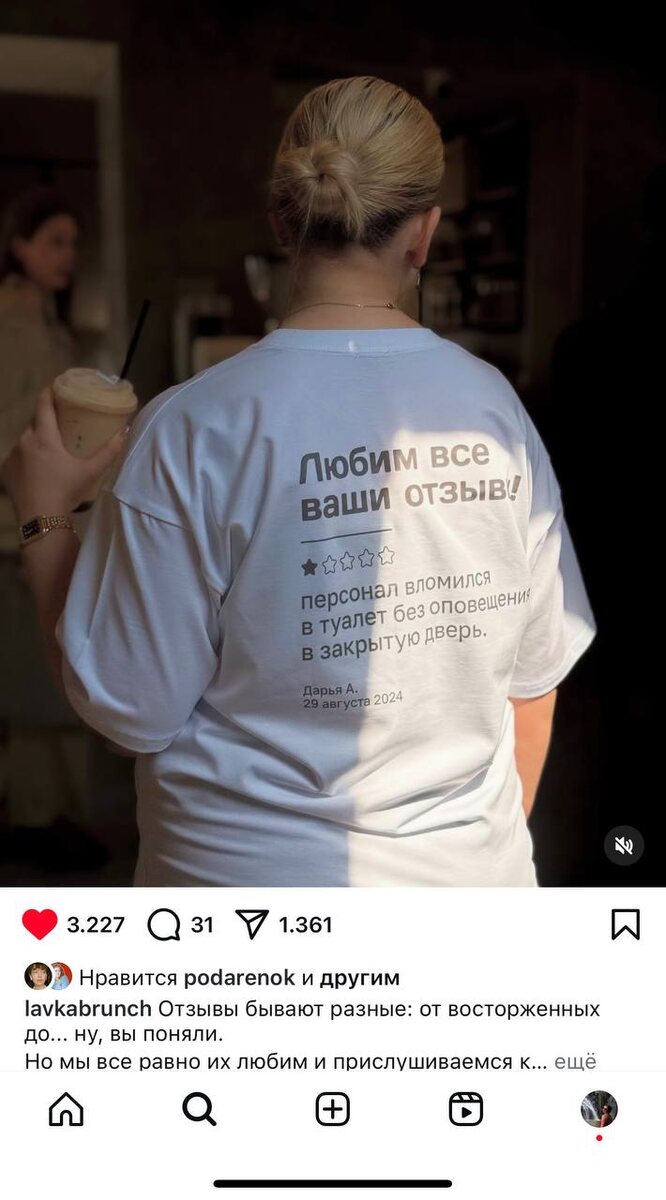 Это фишка. Это стиль. Это вирусный маркетинг, который выстрелил. Люди начали фотографировать официантов, выкладывать в соцсети, писать новые отзывы ради шанса попасть на футболку.