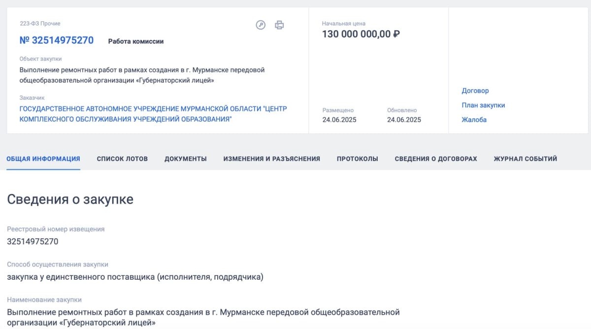 В ответ на пост Читатели «Арктического Обозревателя» обратили внимание на весьма любопытный тендер, размещённый на сайте Госзакупок: «Выполнение ремонтных работ в рамках создания в г. Мурманске передовой общеобразовательной организации «Губернаторский лицей». Заказчиком является областное учреждение «Центр комплексного обслуживания учреждений образования», а начальная цена контракта – 130 млн рублей. Закупка производится по 223 ФЗ у единственного поставщика. По этой причине тендер в день размещения был переведён в статус «работа комиссии». Стало быть, построенное городским УКСом здание при смене собственника на областной ЦКОУО и при переходе из статуса «школа на Советской» в статус «Губернаторский лицей» потребовало ремонта аж за 130 млн? Не кисло, скажу я вам: на долгожданный ремонт фасада и внутренних помещений в гимназии № 3 (два контракта) выполняются всего за 114 млн! И это – на здание 1935 года постройки! В качестве напоминания: – на строительство школы на 500 мест планировало