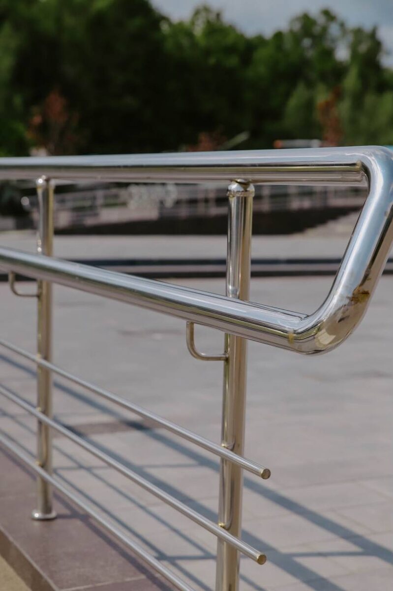Тонкие, словно нити, трубы ограждения создают «прозрачный» дизайн без акцента внимания и сосредотачиваются на безопасности пешеходов. Ограждение размещено вдоль спусков и оформлено как тонкая линия.