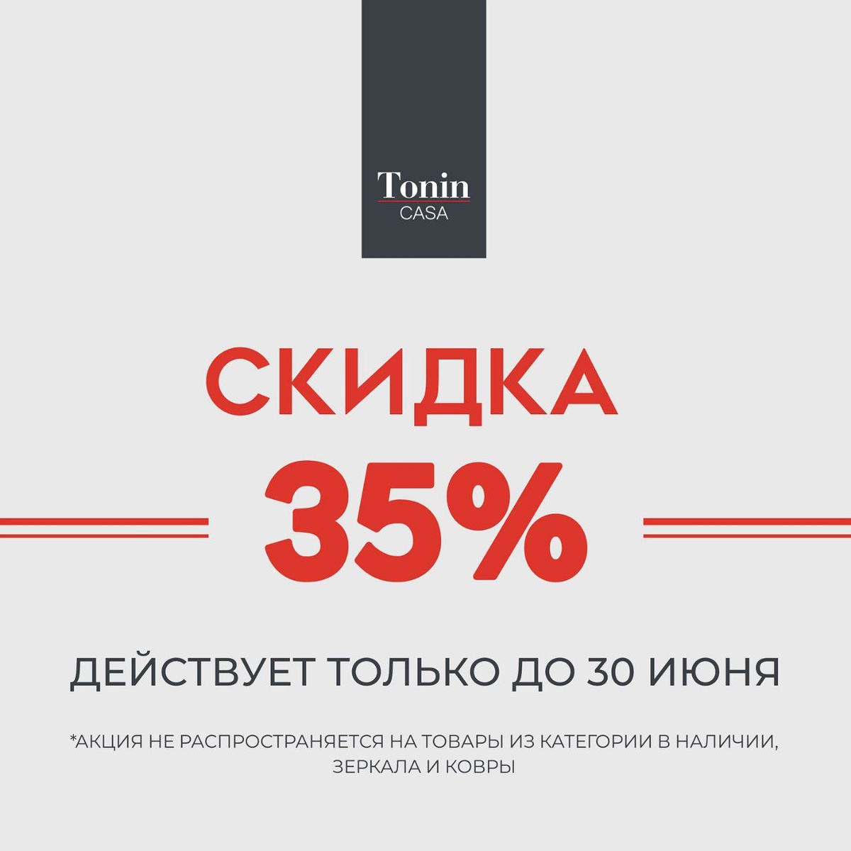 💥 СКИДКА -35% НА ТОВАРЫ TONIN CASA! Впечатляющая скидка от фабрики -35%: только до 30 июня 2025 года. Скидка распространяется на обеденные столы, стулья, барные стулья, серванты, консоли, тв-тумбы, кровати, мебель для спальни, полки, стеллажи, витрины, на предметы освещения и декора. Акция не действует на товары из наличия, зеркала и ковры. В наличии на фабрике представлена Складская Программа. Доставка по всей России. 🇮🇹 Фирменный шоу-рум фабрики 💯 tonin.shop - официальный дилер ❗ Выгодные цены 🌏 Доставка по России 📞 Если у Вас появились вопросы, звоните: 8 800 250 96 54
