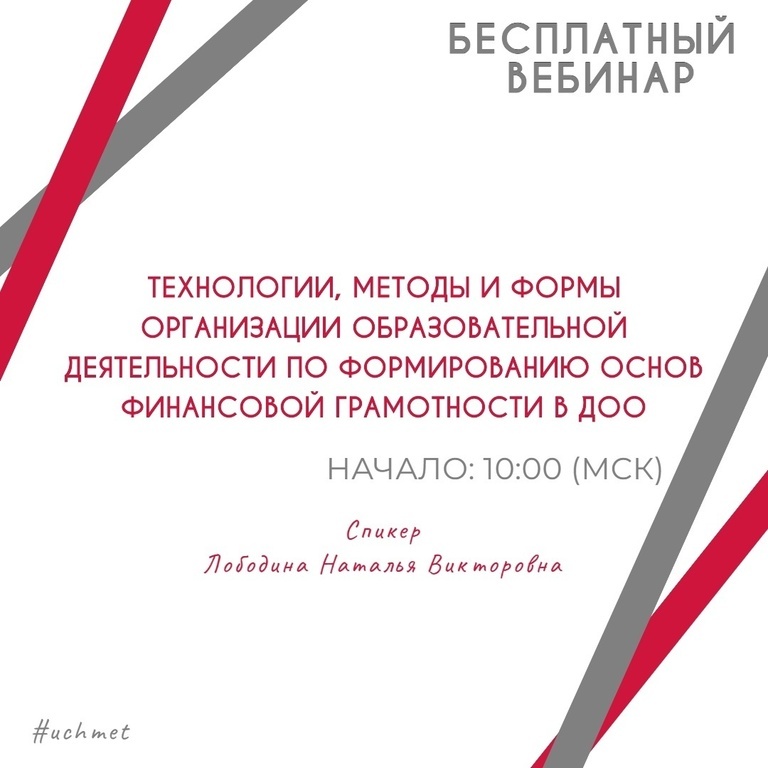 Международный вебинар «Технологии, методы и формы организации образовательной деятельности по формированию основ финансовой грамотности в ДОО» Дата проведения: 26.06.2025 Начало: 10:00 (МСК) https://www.uchmet.ru/events/item/3888111/ На вебинаре слушатели вместе с ведущим познакомятся с современными технологиями, методами и формами организации образовательной̆ деятельности по формированию основ финансовой̆ грамотности в ДОО. На вебинаре будут рассмотрены следующие ВОПРОСЫ: - Теоретические основы: основы финансовой грамотности в дошкольной образовательной организации. - Модернизация развивающей предметно-пространственной среды для формирования основ финансовой грамотности воспитанников ДОО. - Технологии, методы и формы организации образовательной деятельности в ДОО по формированию основ финансовой грамотности. - Сказка как средство формирования финансовой грамотности старших дошкольников. - Развитие финансовой грамотности старших дошкольников в игровой деятельности. - Дидактическая и