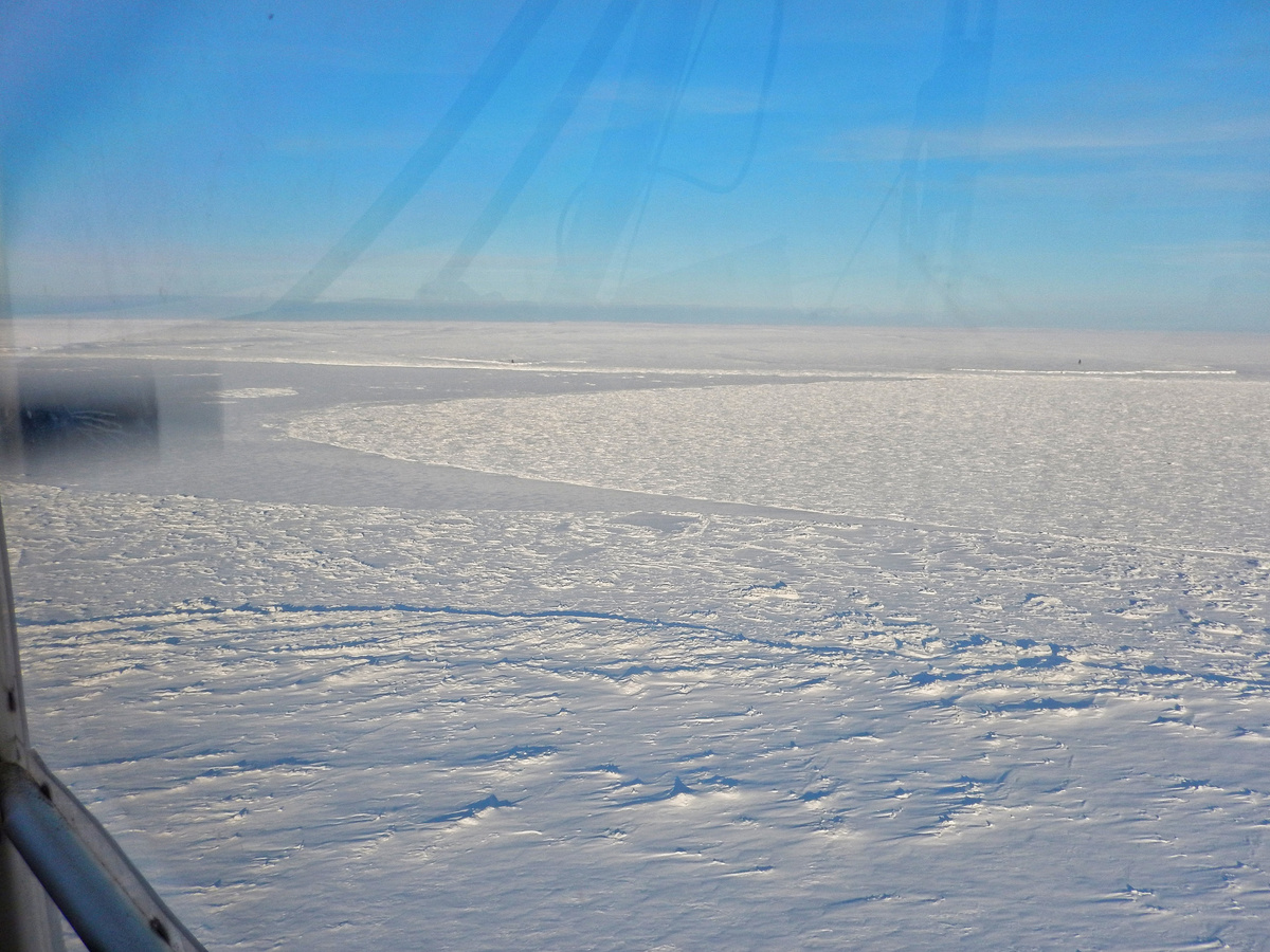 Снижаемся ещё немного и пролетаем над открытой водой, в которой спокойно плещутся нерпы. К сожалению, шлёпанец, на который велась фотосъёмка, не смог их увидеть. Но они там есть.
