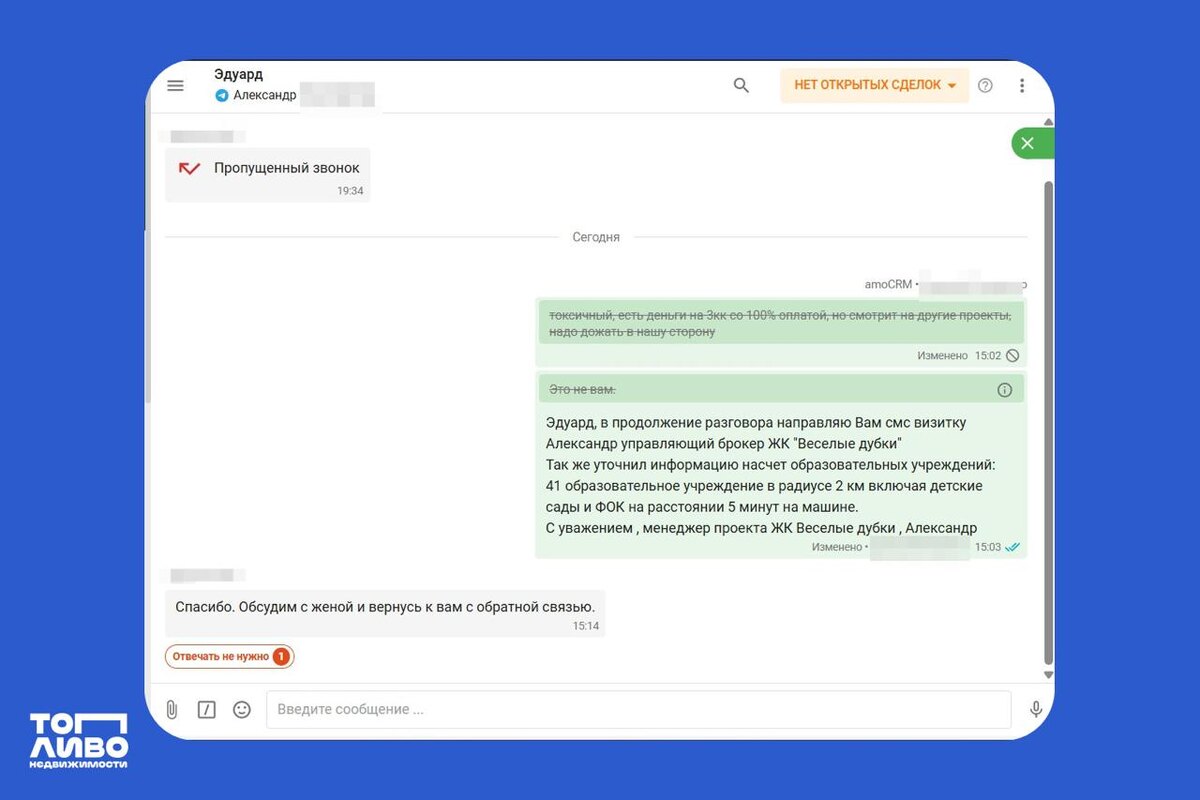 CRM: заметка «не в ту дверь», или как спасти ситуацию за 5 секунд Бывало у вас такое? Закончил диалог с клиентом, решил накатать комментарий о разговоре — и... упс, заметка улетает не в CRM, а клиенту. Паника, пот в три ручья, метание в поисках телефона, чтобы удалить сообщение в мессенджере… Без драмы. Открыли виджет Wazzup24 → удалили сообщение → отредактировали лишнее → продолжили работу. ⌘ ⌘ ⌘ И да, у Ваззапа есть и другие полезные фишки, которые экономят нервы и время. #лайфхак #crm #польза @realestatefuel