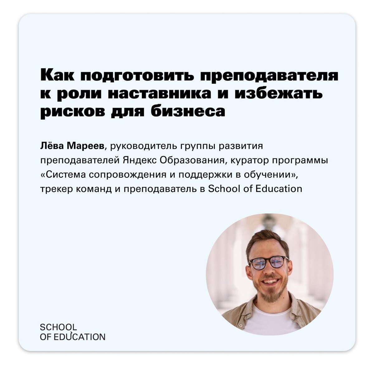 Как подготовить преподавателя к роли наставника и избежать рисков для бизнеса Лёва Мареев, руководитель группы развития преподавателей Яндекс Образования, куратор программы «Система сопровождения и поддержки в обучении», трекер команд и преподаватель в School of Education, в своем выступлении на недавней конференции поднял одну из недооцененных тем в EdTech — качественная и системная подготовка преподавателя. Тезисы выступления мы собрали в карточках выше. Какой вывод мы можем сделать? Системная подготовка преподавателей — это инвестиция в стабильность и рост образовательного бизнеса. Обученный и уверенный наставник формирует тот образовательный опыт, за которым студенты возвращаются и за который платят снова. Посмотреть полную запись конференции Презентации спикеров Полезные материалы от Лёвы Мареева