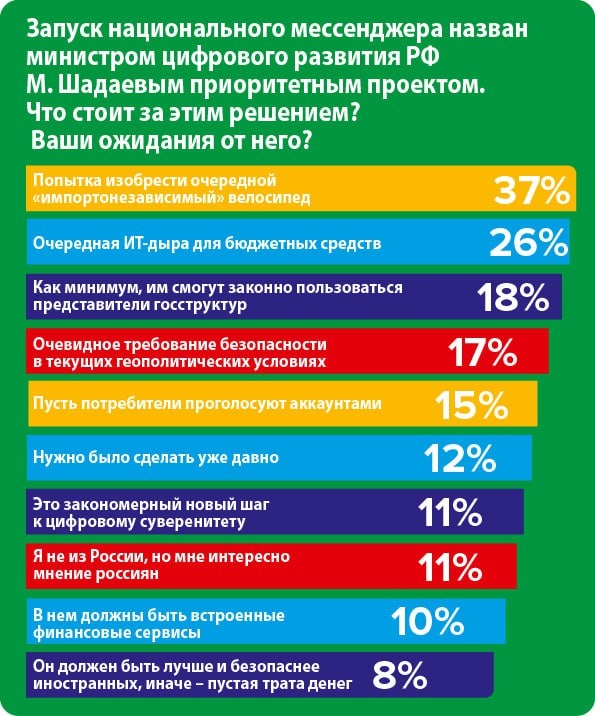 Запуск национального мессенджера – попытка изобрести очередной «импортонезависимый» велосипед. Который нам действительно необходим. Результаты ПЛАС-Опроса от 16 июня Публикуем результаты ПЛАС-Опроса, проведенного PLUSworld c 16 по 24 июня 2025 года в нашем Телеграм-канале. https://plusworld.ru/articles/65372/