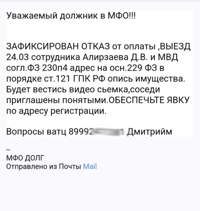 Если у вас начались просрочки по микрозаймам, то вы или уже с этим столкнулись или столкнетесь. И я хочу, чтобы вы были морально готовы и не паниковали. Чуть ниже я описал ситуации и то, как лучше действовать. 🔹 Пришло СМС-сообщение от следователя о том, что вас вызывают в следственный отдел УМВД по заявлению МФО о мошенничестве. В СМС может быть даже указано звание и ФИО сотрудника полици и его номер телефона. Иногда пишут, что приехать нужно с адвокатом. 🔹Вам позвонил некий “следователь” и вызывает вас в УМВД для проведения следственных действий так как МФО написала на вас заявление о мошенничестве. Без паники! Что делать и почему не нужно переживать: 🔹Следователи не рассылают СМС и не звонят. Они вообще не занимаются такими вопросами. Если бы заявление действительно было бы написано, то с вами бы связывался участковый. 🔹Проверьте номер телефона через любой поисковик - уверен, что в результатах поиска вы увидите, что это телефон коллекторов. но даже если поиск не даст результатов