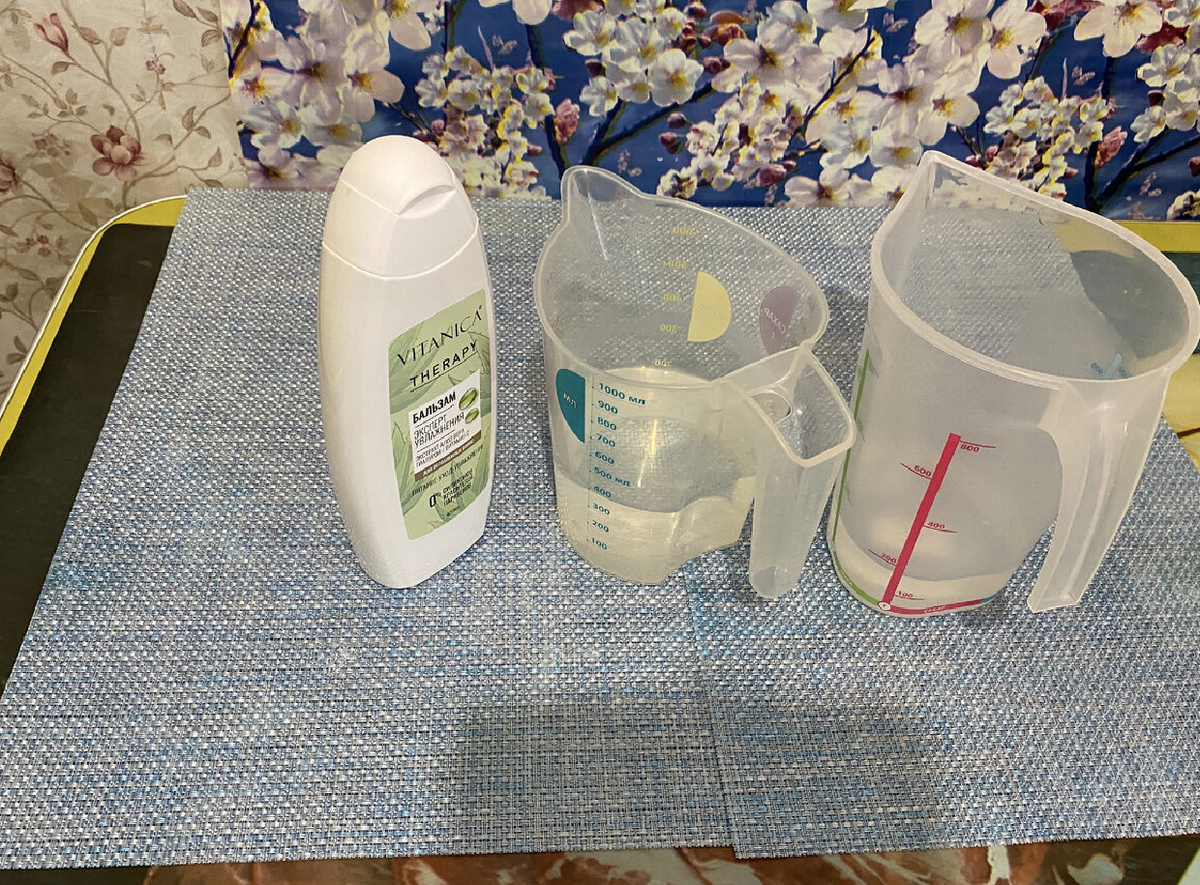 На основе бальзама для волос можно создать домашний кондиционер для белья. Для этого потребуется: 400 мл воды, 200 мл уксуса с концентрацией 9%, 100 мл бальзама.