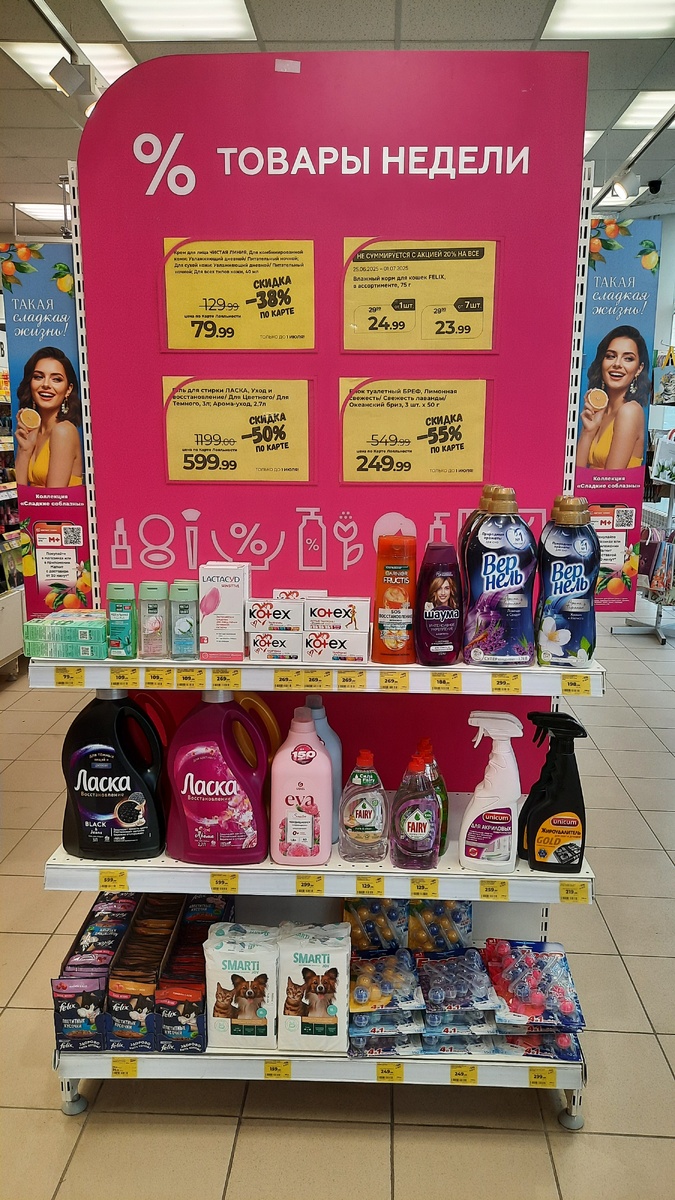 Всех приветствую, мои дорогие друзья и подписчики. В Магнит Косметик началась новая неделя скидок. Покажу вам витрину с товарами со скидкой. Магазин находится по адресу Ростовская область, Зерноградский район, станица Мечётинская, улица Ленина, 50 Неделя скидок продлится с 25 июня до 1 июля 2025 года. Крем для лица Чистая линия в ассортименте 40 мл цена со скидкой по карте 79.99 рублей. Гель для умывания глубокого действия Чистая линия 100 мл цена со скидкой по карте 109.99 рублей. Мицеллярная вода +гиалурон для всех типов волос 3 в 1 100 мл цена со скидкой по карте 109.99 руб. Лосьон для снятия макияжа с век бережное очищение Чистая линия 100 мл цена со скидкой по карте 109.99 рублей. Экстрамягкое средство для ежедневной интимной гигиены для чувствительной кожи 200 мл цена со скидкой по карте 269.99 рублей. Тампоны Kotex Normal 16 штук цена со скидкой по карте 269.99 рублей . Шампунь Garnier Fructis интенсивно восстанавливающий Шампунь для волос 400 мл цена со скидкой по к