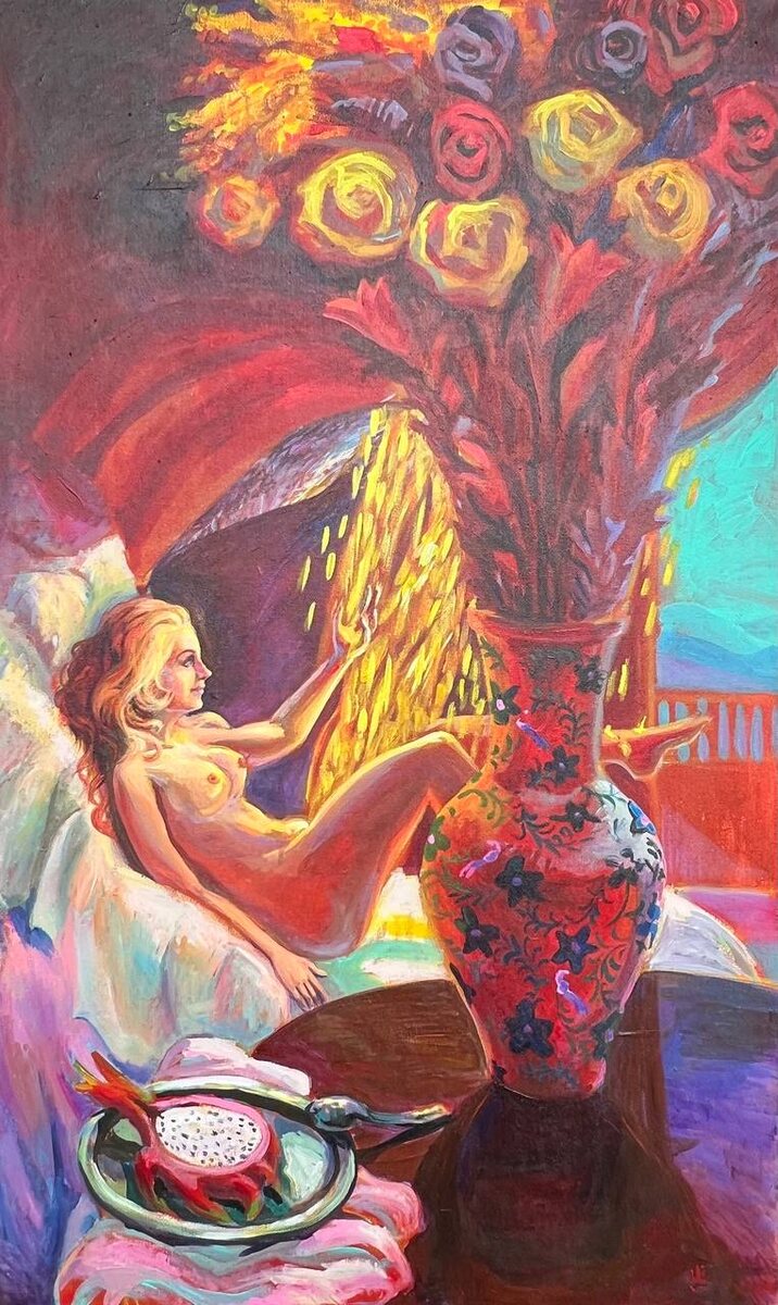 Букет для Данаи 100х60 холст/акрил 2025 ••• Свою особую точку зрения на тему, да и на искусство в целом, представляет Анастасия Иликпаева, главный «панк-художник» галереи. Ее работа «Букет для Данаи» заставляет вспомнить о непосредственности фовистов или, ближе к современности, о бесшабашности «Новых тупых». Впрочем эти аналогии не исчерпывают творчества художницы, ее демарш и свободнее, и ярче. Радикальна в «Букете» как иконографическая программа (назовем это так — будем академичны в подборе терминов), так и формальное решение — дерзкое помещение на передний план вазы с потрясающим букетом. ••• Поразмышлять на тему многозначности летнего цветения можно на выставке «Цветы и лето» до 10 июля 2025. ••• Москва. Ходынский бульвар 20а, с 11:00 до 21:00 ежедневно. Выставка бесплатная, работы продаются. Вся контактная информация на сайте YOLKA.art