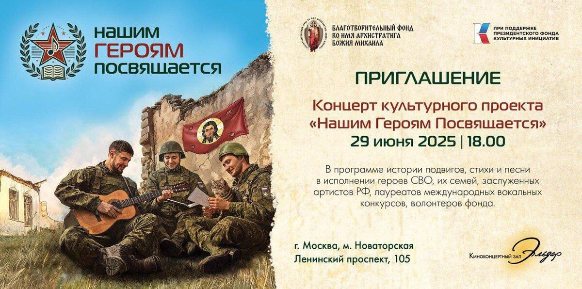 #отгенералачеркасова Этим приглашением можно воспользоваться как входным билетом. На концерте вы встетитесь с воинами СВО и их песнями, участвуют солисты-волонтёры лауреаты ,,Серебрянного голоса России", знакомые вам поэты, военный оркестр. Ждём вас, вашего участия и вашей поддержки.