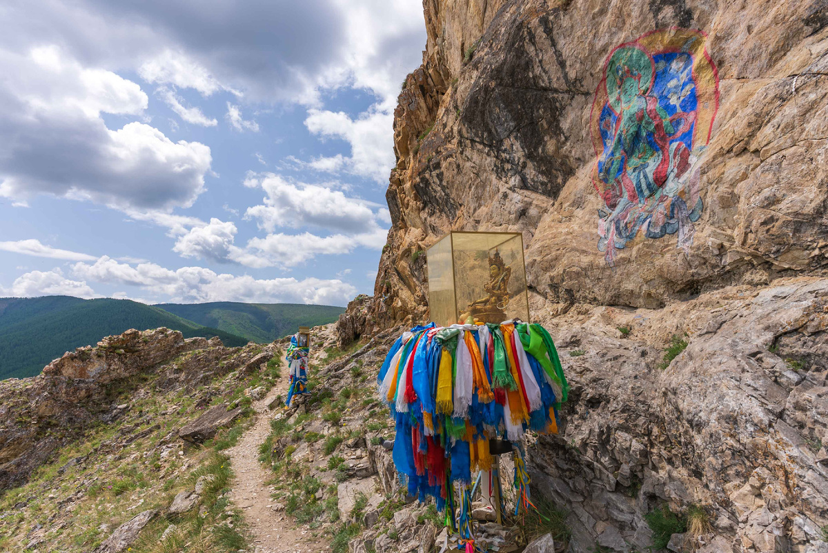 Зеленая Тара: место силы и исполнения желаний в Окинском районе. Это одно из самых загадочных и атмосферных мест Окинского района, священное место паломничества, где, согласно преданиям, проявляется милосердная буддийская богиня, дарующая благословения. Особенно ей молятся о детях, семейном счастье и исполнении самых сокровенных желаний. Мы попали сюда почти случайно — будто сама богиня позвала нас. Впереди, среди скал, мелькнуло что-то сверкающее, и только присмотревшись, мы разглядели гроты и тропу, ведущую вверх. Решили подняться — и нисколько не пожалели. Путь оказался удивительно легким и живописным, особенно если идти не напрямую по склону, как мы, а по гребню от леса. А наверху нас ждала награда — бескрайние долины, пропитанные древними молитвами, и… сундук с «драгоценностями». В нем — не золото и камни, а нечто куда более ценное: детские игрушки, записки с желаниями, подношения. Глядя на них, невольно веришь: каждый, кто пришел сюда, шел с чистым сердцем. Случайные люди в та