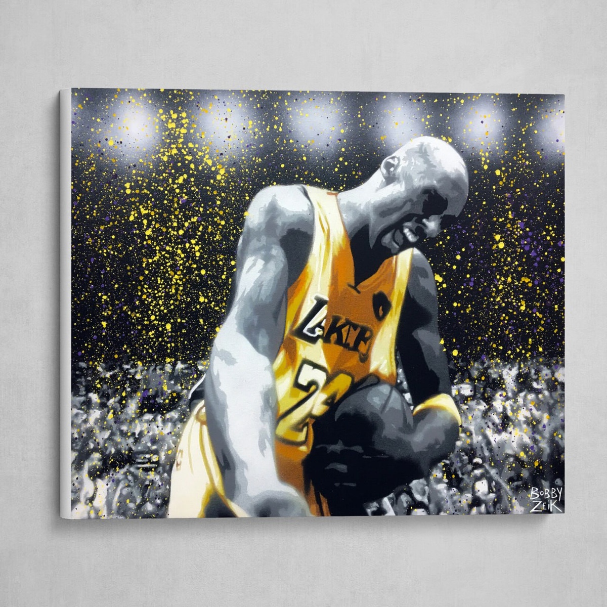 Картина передает невероятную энергетику победы, усиленную яркими вспышками золотых и фиолетовых красок, которые символизируют стремление и целеустремленность. На ней изображен Коби Брайант, поглощенный моментом триумфа, его улыбка говорит о радости от победы. Это не просто спортивный момент, а символ вдохновения, упорства и страсти. Динамика тела и цветовые акценты на фоне создают ощущение мгновенного подъёма и полёта, когда каждый шаг — это преодоление, а победа — результат труда и веры в себя. Такая работа напоминает о том, как важно стремиться к своим целям и не останавливаться. ✨🏀