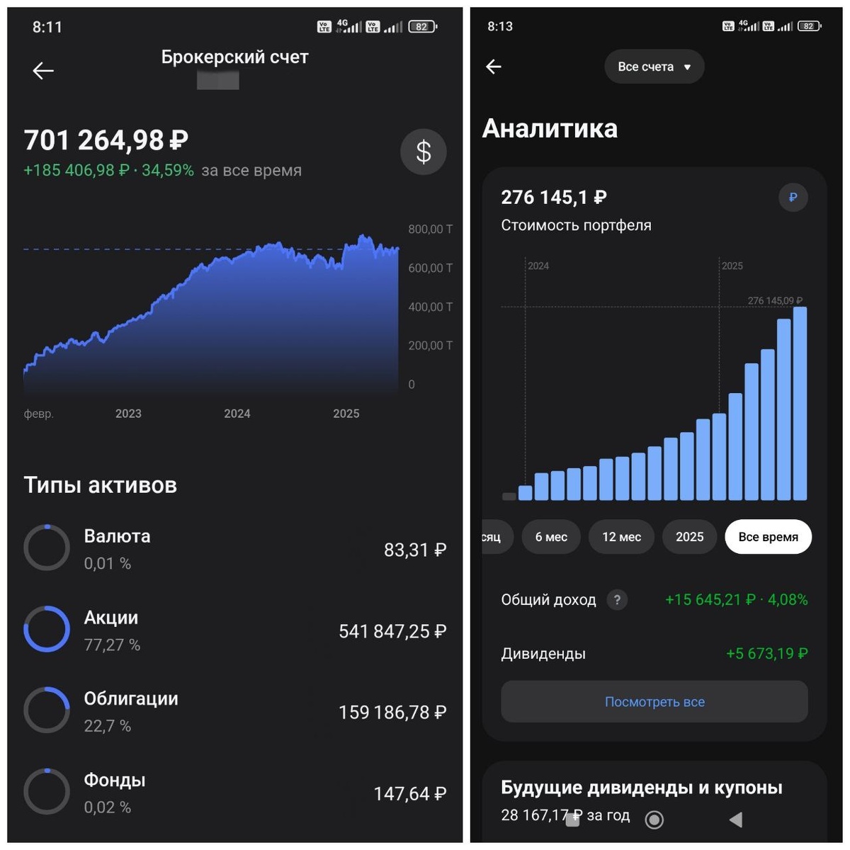 🔤🔤🔤🔤🔤🔤(скрины от двух брокеров.) Всем доброго времени суток 🍸 📌 Продолжаю понемногу двигаться к своей цели в этом году довести инвест портфель до 1 000 000 💸 🔍 Портфель на 28 мая был в этом посте 📊 И так на сегодня Акции занимают 66% / Облигации 34% Считаю баланс приемлемым вес облигаций 30-40% от портфеля. 🙂 Итак состав акций на сегодня: Лукойл ⛽️ $LKOH - 8,3% Транснефть пр. ⛽️ $TRNFP - 8,0% Сбербанк пр.🏦 $SBERP - 6,7% ФосАгро 🌾 $PHOR - 6,5% Татнефть пр.⛽️ $TATNP -5,7% Роснефть ⛽️ $ROSN -5,1% Новатэк 🔋 $NVTK - 4,9% Северсталь 💿 $CHMF - 3,9% Газпромнефть ⛽️ $SIBN -3,7% Сбербанк 🏦 $SBER -2,2% Яндекс 📱 $YDEX -1,7% ММК 💿 $MAGN -1,5% Норникель 💿 $GMKN -1,1% Сургутнефтегаз ⛽️$SNGSP-1,1% Т-техно 🏦 $T -1% X5 🍏 $X5 - 0,7 % Совкомфлот ⚓️ $FLOT -0,5% ЭсЭфАй 🏦 $SFIN - 0,5% Займер 💵 $ZAYM - 0,5% АЛРОСА 💎 $ALRS - 0,5% Банк СП 🏦 $BSPB - 0,4% НоваБев 🍷 $BELU -0,4% ТЗА 📱$TUZA - 0,3% Газпром ⛽️ $GAZP-0,3% ЕвроЭлтех 🎛 $EELT -0,3% Европлан 🚗 $LEAS - 0,2% НЛМК 💿