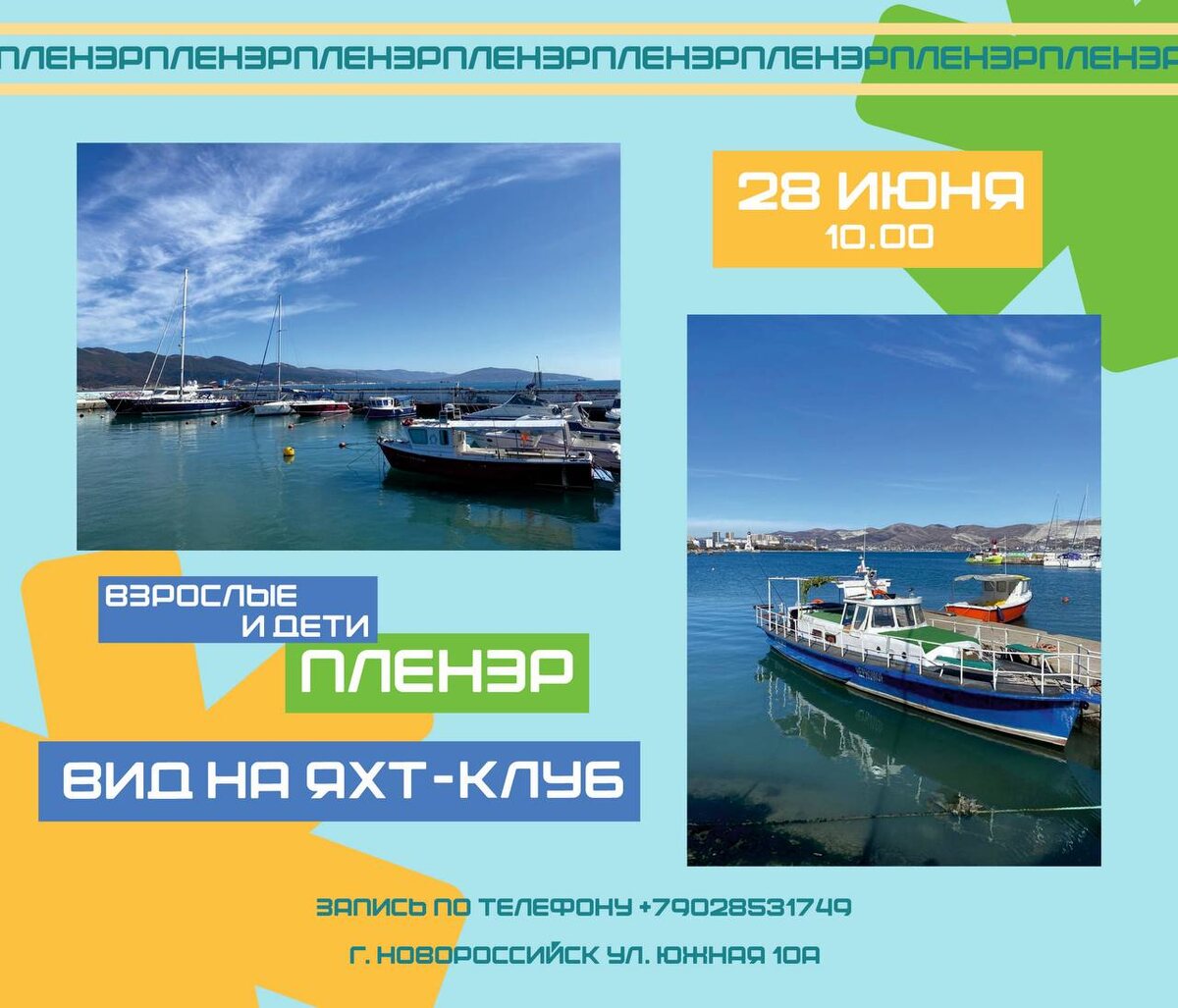 ⛵️ Пленэр с видом на яхт-клуб! 😇 Приглашаем вас на творческую встречу на свежем воздухе! Встречаемся в нашей студии в 09:50, в 10:00 отправляемся на пленэр! Возвращаемся в 12:30. Будем писать пейзаж моря, яхт и многое другое! 📍 Где будем творить: - 28.06 — Яхт-клуб ✅ Что взять с собой: - Бутылку воды - Головной убор - Верхнюю одежду (на случай прохлады) - Хорошее настроение! 🌧️ Важно! В случае плохой погоды (дождя) занятия будут проходить в нашей студии. ☎️ Запись по телефону: 8-902-853-17-49 8-918-064-65-00 📱 Запись онлайн: https://yandex.ru/business/widget/request/company/52017563801 📱 Мы находимся по адресу - г.Новороссийск, улица Южная 10А