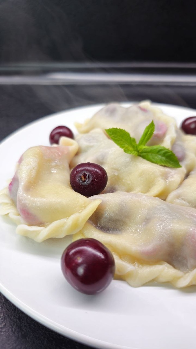 И вот они, горячие и парящие, с капелькой сметаны и посыпкой сахара! Откусываешь вареник и наслаждаешься. Сок течет по рукам, но этого даже не замечаешь. Как же это было вкусно. Я леплю вареники поменьше размером, но все равно получается по-летнему вкусно. Как готовить: