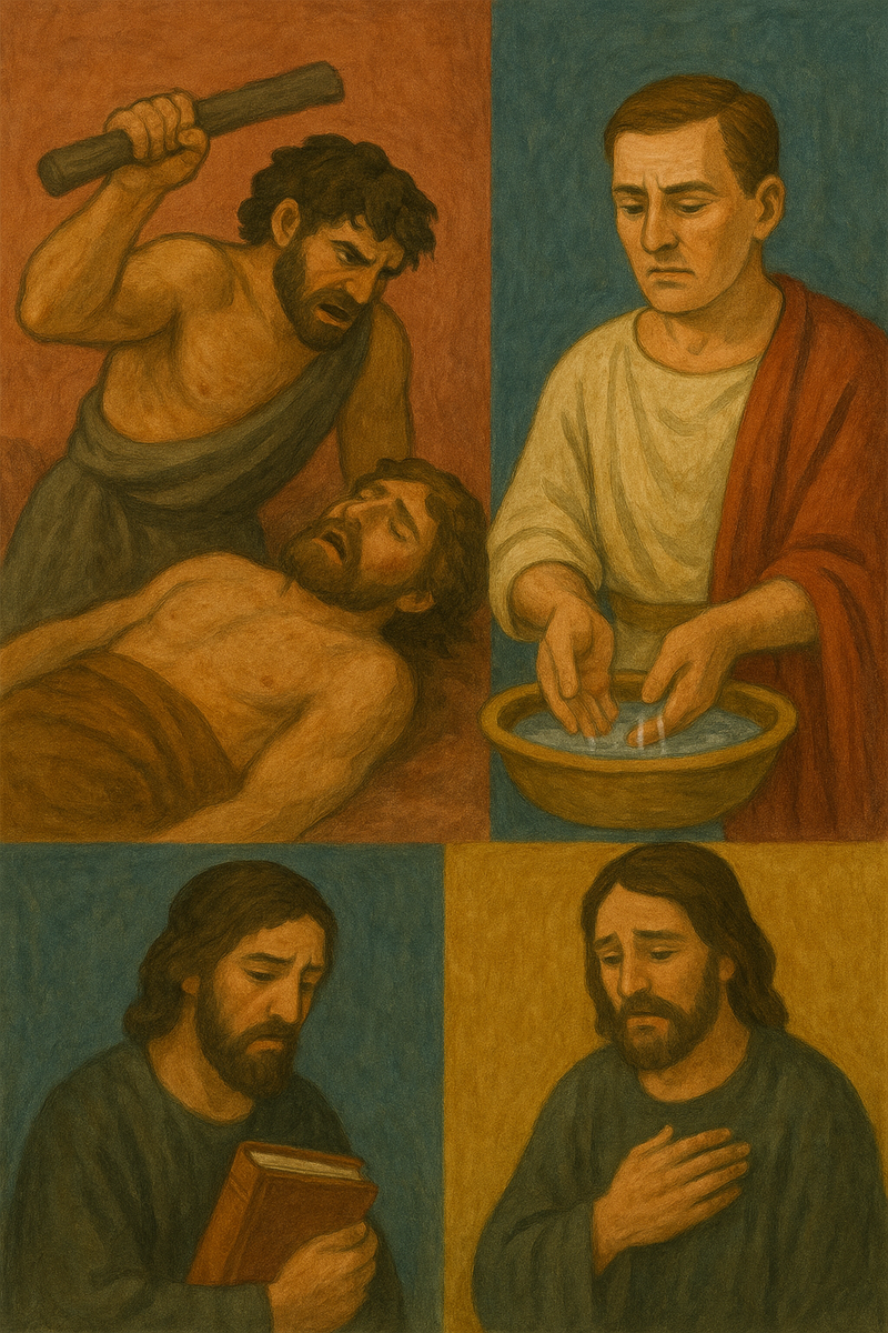 Пилат умывает руки,прекрасно понимая, что предает смерти невиновного.