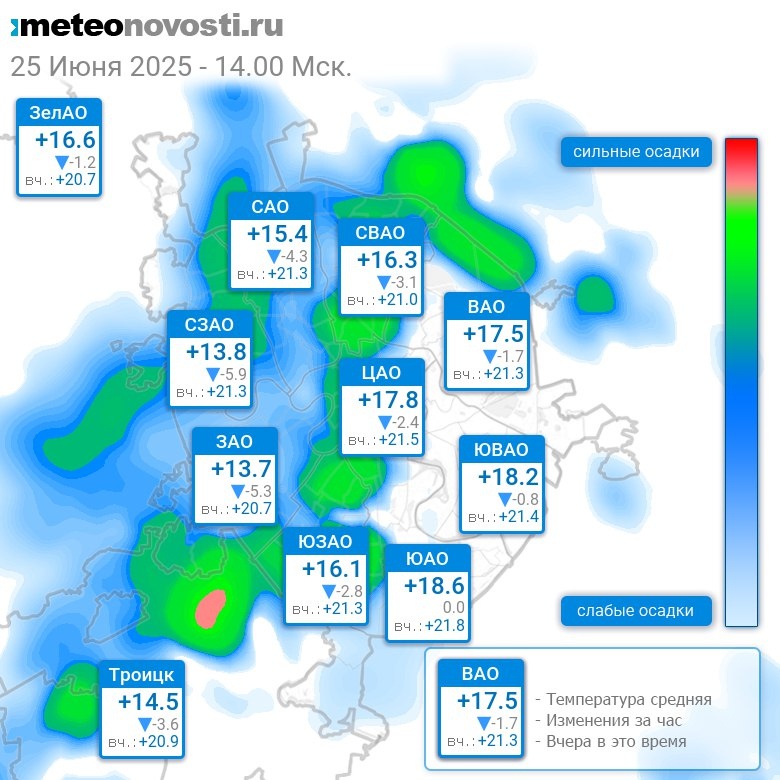 В 14:00 в Москве было от +11.7°C до +20°C, средняя температура +16.4°C #погода #Москва #лето #температура #25июня #среда