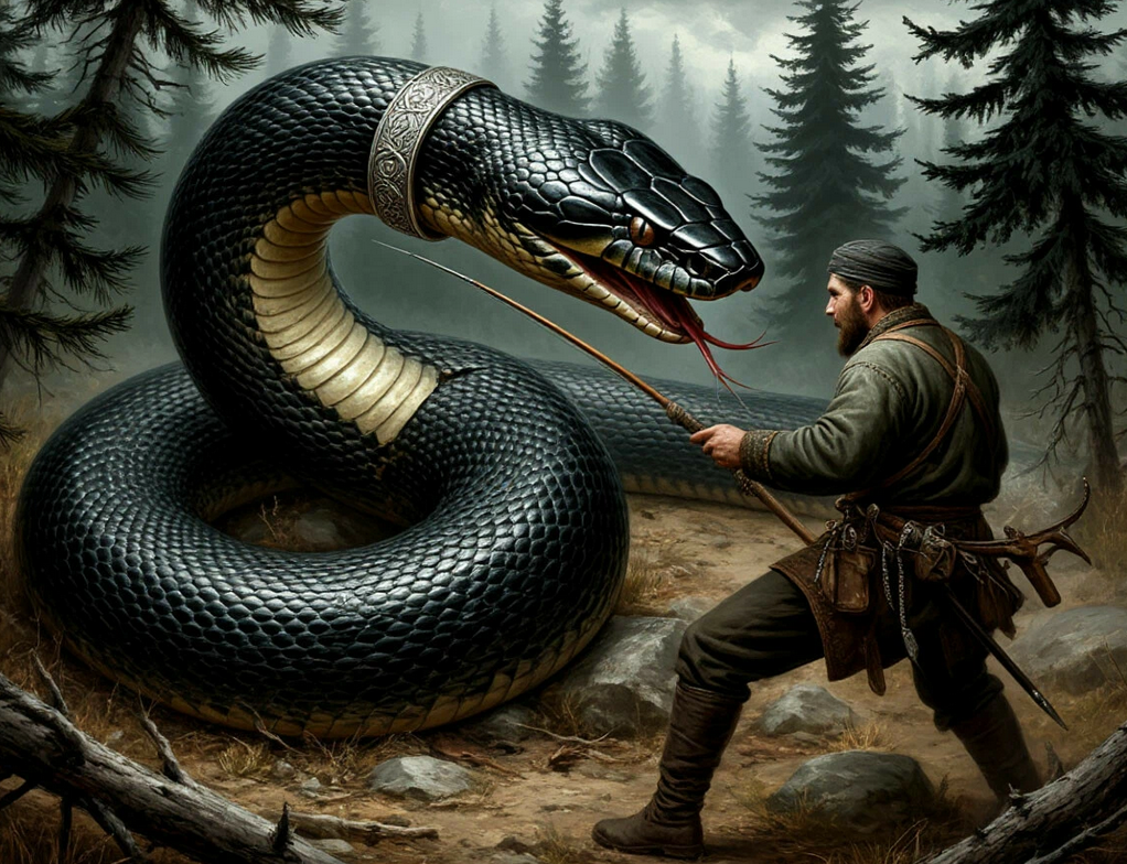 И Змеиный царь знает, что сильны люди. Даже если первым ужалит, успеет охотник пикой острой брюхо пробить.