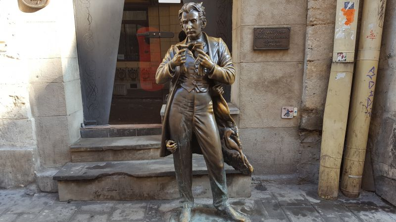Памятник этому человеку, возведённый в его родном городе, - пожалуй, один из самых необычных и провокационных в мире. На груди и в зрачках у него отверстия-линзы, в которых можно увидеть сменяющиеся картинки, из-под пальто высовываются женские пальцы, а в карман брюк можно сунуть руку и нащупать... то, что предусмотрено природой.