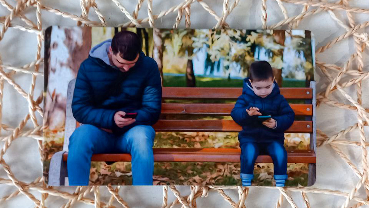 Колода Семья Перед вами — яркий образ отчуждения, упущенных возможностей для связи и погружённости в виртуальный мир. Отец и сын сидят на одной скамейке, но между ними — дистанция, холод и отсутствие живого общения.