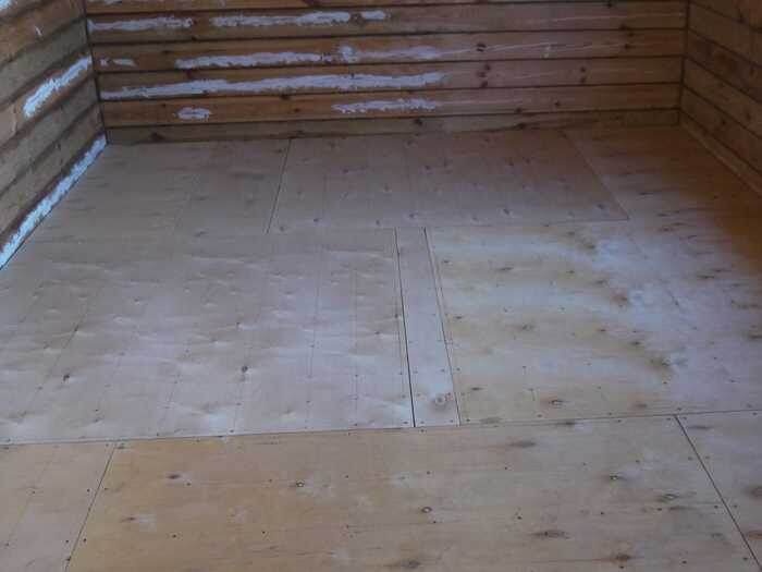 Убедившись, что пол относительно ровный, можно приступать к укладке фанеры. Толщина фанерных листов, которые используют для формирования пола, варьируется от 10 до 20 мм. Чем толще материал, тем лучше он скроет неровности досок. К тому же полы, сделанные из более толстой фанеры, будут заметно теплее. Но с другой стороны, толстая фанера будет стоить дороже. Поэтому необходимо соблюсти оптимальный баланс при подборе этого стройматериала. Надо выбрать фанеру с лучшими для каждого конкретного случая характеристиками, необходимо стремиться к тому, чтобы строительный бюджет не был неоправданно высоким. В нашем случае использовались фанерные листы толщиной 15 мм.