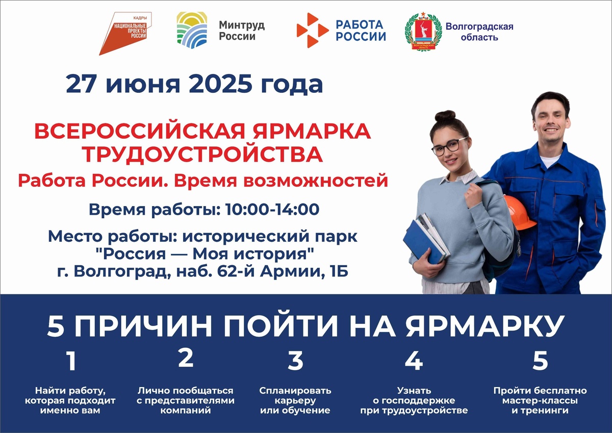 Жителей Волгоградской области приглашают найти работу на ярмарке трудоустройства 27 июня в Волгоградской области пройдет федеральный этап Всероссийской ярмарки трудоустройства «Работа России. Время возможностей» — региональный этап проходил в апреле этого года, в нем приняли участие более 5,5 тысяч соискателей. https://маяк-котово.рф/oblast/26211-zhiteley-volgogradskoy-oblasti-priglashayut-nayti-rabotu-na-yarmarke-trudoustroystva.html