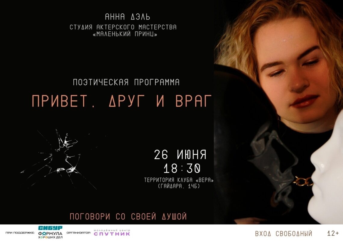 Дзержинцев приглашают на поэтическую программу «Привет, друг и враг», которая состоится 26 июня в Клубе инвалидов «Вера» (Гайдара, 14Б) при Молодежном центре «Спутник». Мероприятие проходит в рамках проекта «Искусство на ковре», реализуемого при грантовой поддержке программы социальных инвестиций СИБУРа «Формула хороших дел». Юные артисты под руководством своего инициативного руководителя Анны Захаровой регулярно устраивают поэтические вечера, но эта встреча, по их словам, не совсем стандартная: она будет проходить в формате спектакля. Название программы не случайно: «Привет, друг и враг» – одно из стихотворений Анны, само мероприятие приурочено к ее Дню рождения. – Мне всегда хотелось провести поэтический вечер к своему празднику, – с улыбкой объясняет руководитель студии, – поэтому большинство стихотворений прочитаю лично. Также меня поддержат воспитанники – юные актеры и мелодекламаторы, поэты из Нижнего Новгорода, мои хорошие знакомые Наталья Гордиенко, Юрий Беляков, Тен Рок – он ж