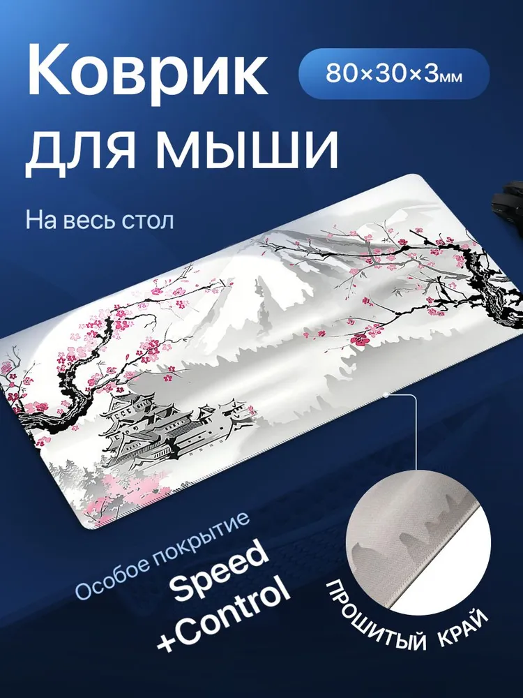 *Коврик компьютерный большой с изображением цветка Сакуры, размер: 800х300 позволяет полностью погрузиться в игровую атмосферу, не ограничиваясь игровой площадью для мыши.