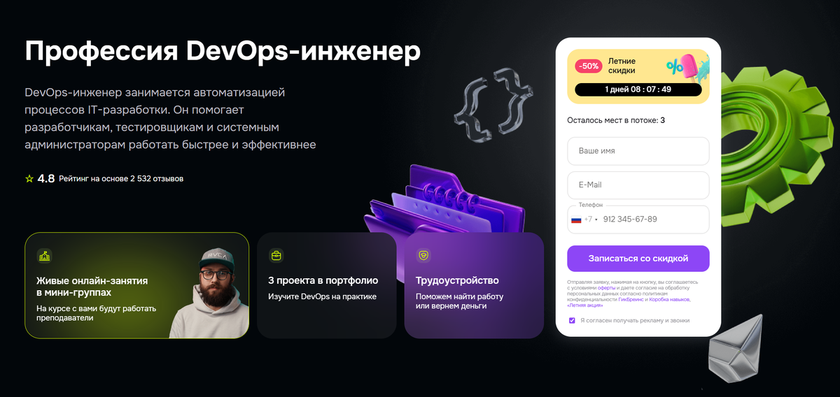 Программа курса продумана таким образом, чтобы студенты могли быстро освоить ключевые навыки, которые помогут найти работу в одной из самых востребованных областей IT. Курс включает в себя теоретические и практические модули, что дает возможность сразу применить знания. В процессе обучения используются реальные сценарии, что позволяет лучше понять, как DevOps-инженер решает задачи в профессиональной среде. Также предусмотрены консультации с экспертами и дополнительное сопровождение в процессе обучения, что помогает учащимся не только освоить материал, но и подготовиться к трудовым будням в этой сфере.