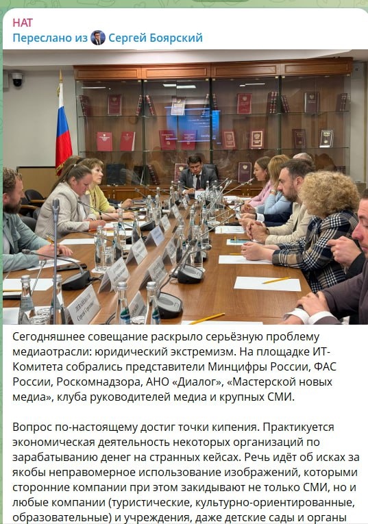 Надо ж, какое название выбрали "на самом верху" для работы множества серых контор с липовыми юристами, услугами которых пользуются всякие разные авторские общества, которые пользуются правовым вакуумом в ширнармассах и проводят репрессии чисто в жанре 37го года, если не сказать - "геноцид" творческого сообщества и малого бизнеса. ЮРИДИЧЕСКИЙ ЭКСТРЕМИЗМ Так, глядишь, и РАО с их филькиными грамотами прижмут, пока они не обанкротили все телеканалы, радиостанции, стриминговые сервисы и самих авторов, которые не видят денег... и не лопнули, как жирный, напившийся крови комар, оставив после себя выжженную землю. Настрогали юристов, и теперь заставляют их обдирать трудовой народ, делясь баблом с кем надо. Онлайн-кинотеатры вот тоже против новых филькиных грамот так называемого Российского Авторского Общества. > Сегодняшнее совещание раскрыло серьёзную проблему медиаотрасли: юридический экстремизм. На площадке ИТ-Комитета собрались представители Минцифры России, ФАС России, Роскомнадзора,
