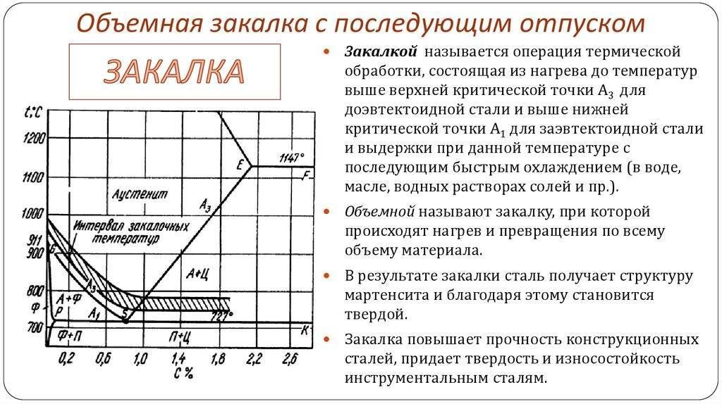 Объемная закалка углеродистой стали использует технологию непрерывного охлаждения детали в воде. Объемная закалка легированной стали подразумевает отпуск в масле.