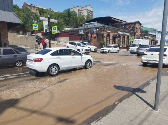 Поток воды настолько сильный, что вода дошла до Береговой и затопила автомобили. Пешеходам приходилось перепрыгивать через потоки, но остаться сухими не удалось никому.