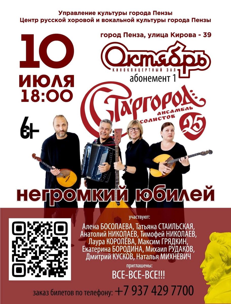 clck.ru/3MgreC Друзья! ПРИГЛАШЕНЫ ВСЕ-ВСЕ-ВСЕ!!! Негромкий юбилей отметим вместе! ******** Подводя итоги юбилейного концертного сезона, хочется сказать, что наш проект НАРОДНАЯ ФИЛАРМОНИЯ, посвященный 25-летию ансамбля, удался! **** Более 40!!! концертов в районах Пензенской области и городах России! **** 10 июля в 18 часов – закрытие юбилейного концертного сезона Губернаторского ансамбля солистов СТАРГОРОД! В концерте участвуют: Алёна Босолаева; Заслуженная артистка Пензенской области Татьяна Стаильская; Максим Грядкин; Анатолий Николаев; Тимофей Николаев; Екатерина Варламова-Бородина; Лаура Королева; Дмитрий Кусков; Наталья Михневич; Ансамбль Старгород: Заслуженная артистка Пензенской области Татьяна Кокорина; Заслуженный артист Пензенской области Александр Ивлиев; Заслуженный артист Пензенской области Михаил Чепышев; Заслуженный артист России Михаил Кокорин.