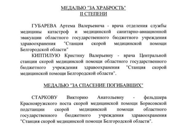 Путин наградил медалями троих белгородских медиков Трое сотрудников белгородской станции скорой помощи награждены президентом России Владимиром Путиным за свою работу, следует из указа главы государства на сайте Кремля. Так медалью «За храбрость» 2-й степени отмечены врач медицины катастроф Артём Губарев и врач центральной станции скорой помощи Кристина Киптилая. Медалью «За спасение погибавших» награждена фельдшер Краснояружского поста Борисовской подстанции скорой помощи Виктория Старкова. Подписаться на 🗞🗞 | Прислать новость