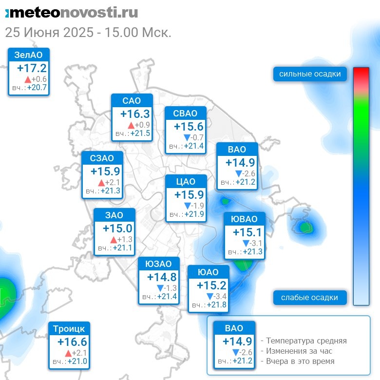 В 15:00 в Москве было от +13.7°C до +17.6°C, средняя температура +15.7°C #погода #Москва #лето #температура #25июня #среда