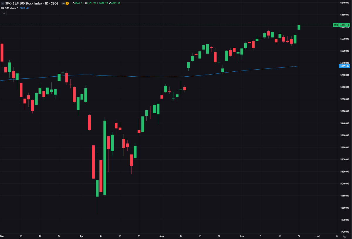 Уолл-стрит, похоже, рада, что Двенадцатидневная война, как все надеются, осталась позади. Фондовый рынок вырос почти на 1% в понедельник и чуть более чем на 1% во вторник. Индекс закрылся на самом высоком уровне за 4 месяца, и теперь $SPX всего в 0,85% от нового исторического максимума.