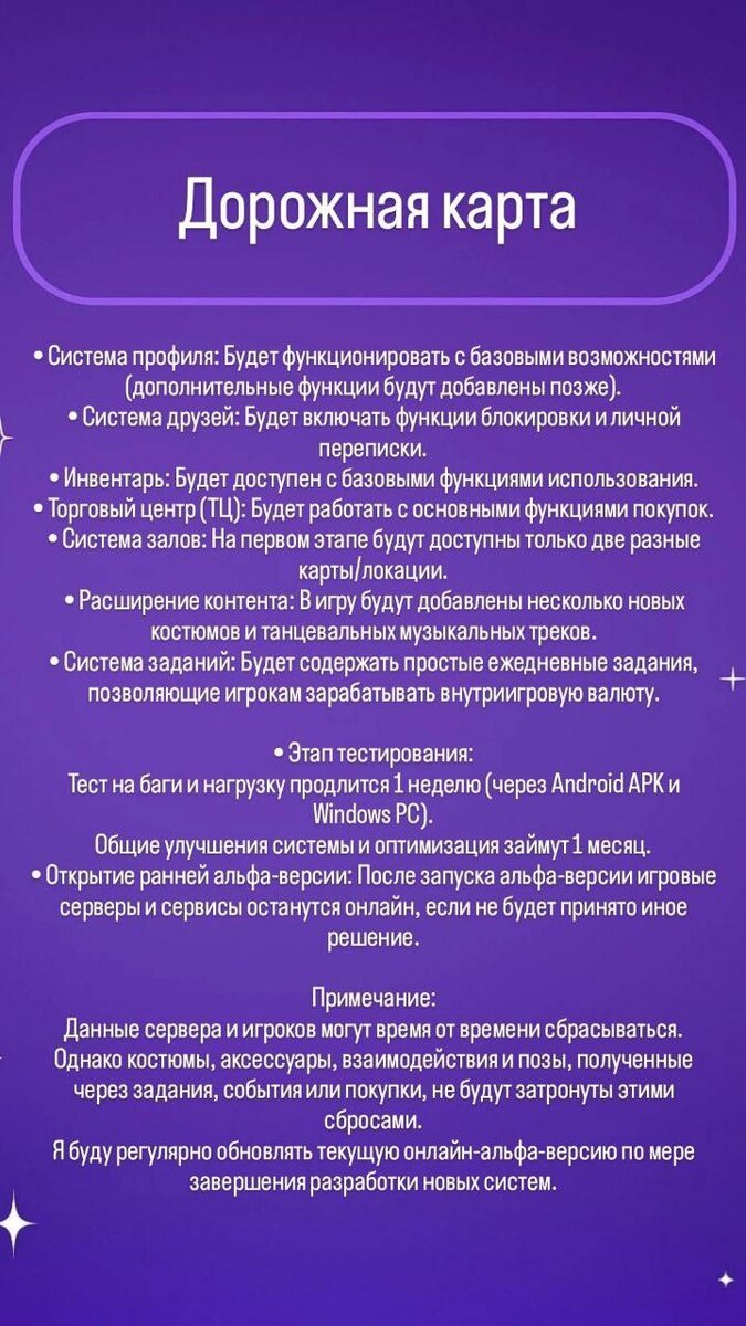 Опубликована дорожная карта проекта «Day Night»! Как видно из поста, основной функционал танцев уже готов – осталось наполнить игру социальными функциями, заданиями, добавить инвентарь и ТЦ. А что думаете вы?