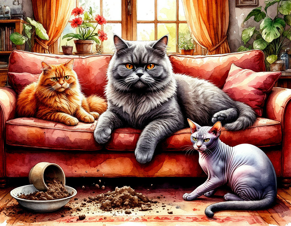 Жизнь Греты и Гектора текла размеренно и вполне сносно. Они делили батарею, сыр, хозяйку и её личное пространство. Пока однажды вечером хозяйка не вернулась домой с запахом чужого кота на джинсах. Грета сразу насторожилась. Она — профессионал. Один вдох, и диагноз: — Кот. — Не кастрирован, — добавил Гектор, нюхнув её ботинок. — И дешёвый корм. Я бы не ел. Их опасения подтвердились. В субботу в дверь позвонили, и в дом вошла подруга хозяйки. За ней, как генерал, шёл Барсик. Точнее, Лорд Барсик Серый Второй, как представила его подруга. Огромный, пушистый, с видом, будто он только что вернулся из салона красоты для шиншилл. — Он у меня временно! — воскликнула хозяйка. — Ну, на пару дней, пока его мама в командировке. Поживут вместе, ничего страшного! Страшное началось через три минуты. Барсик залез в Гретину лежанку. Прямо в лежанку! Туда ни одна душа не лезла с 2017 года. Потом он съел кусок из Гекторовой миски, фыркнул и добавил: — Я на диете, но сойдёт. — Это объявление войны, — про