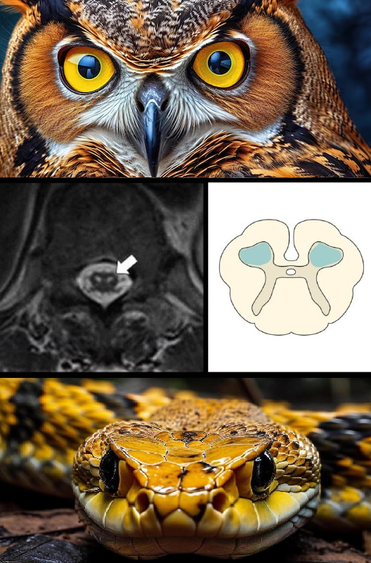 #ТелеМед_интересные_факты 😱А вы знали, что на аксиальных МРТ-изображениях в режиме Т2 можно заметить совиные глаза?👀. Да-да, вам не показалось. 👋Точнее симптом «глаз совы». Он отображается в виде двусторонних симметричных круглых или овальных гиперинтенсивных очагов в клетках передних рогов спинного мозга🧠. 🟠Специфическое, зоологическое название этот симптом получил из-за сигнальных характеристик очагов — более темные очаги этой зоны выглядят как глаза, а более светлые, яркие — как зрачки. То есть на сагиттальных Т2-ВИ гиперинтенсивный очаг имеет «штифтообразный» или «карандашеподобный» вид, затрагивая, как правило, более 2 позвоночных сегментов. ❓Морфологических причин возникновения симптома «глаз совы» может быть несколько: ✔появление зон кистозного некроза в передних рогах серого вещества спинного мозга; ✔хроническая компрессионная миелопатия; ✔оптикомиелит спинальная; ✔мышечная атрофия. 🟣У симптома «глаз ночного охотника» есть и другие альтернативные название – «глаза змеи»🐍
