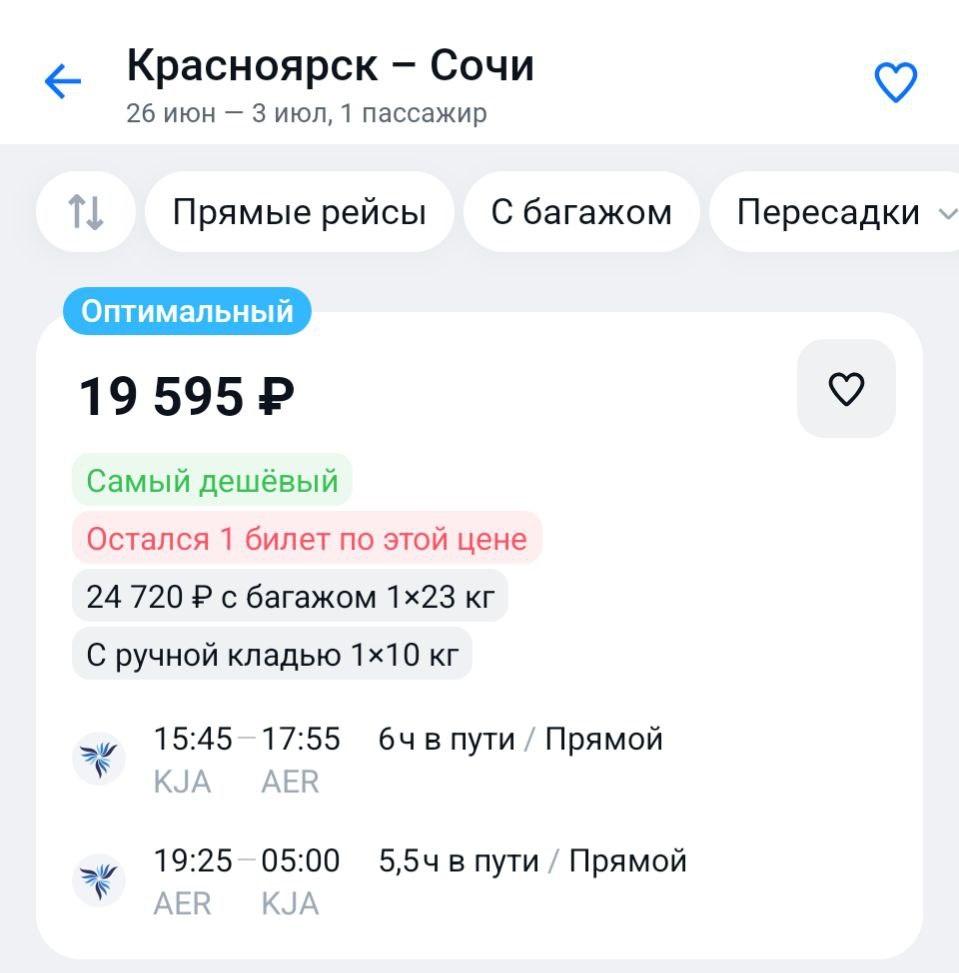 Ах да, Сочи же, меньше 20к)) https://aviasales.tpm.lv/4SsDaExi #AER @KJA