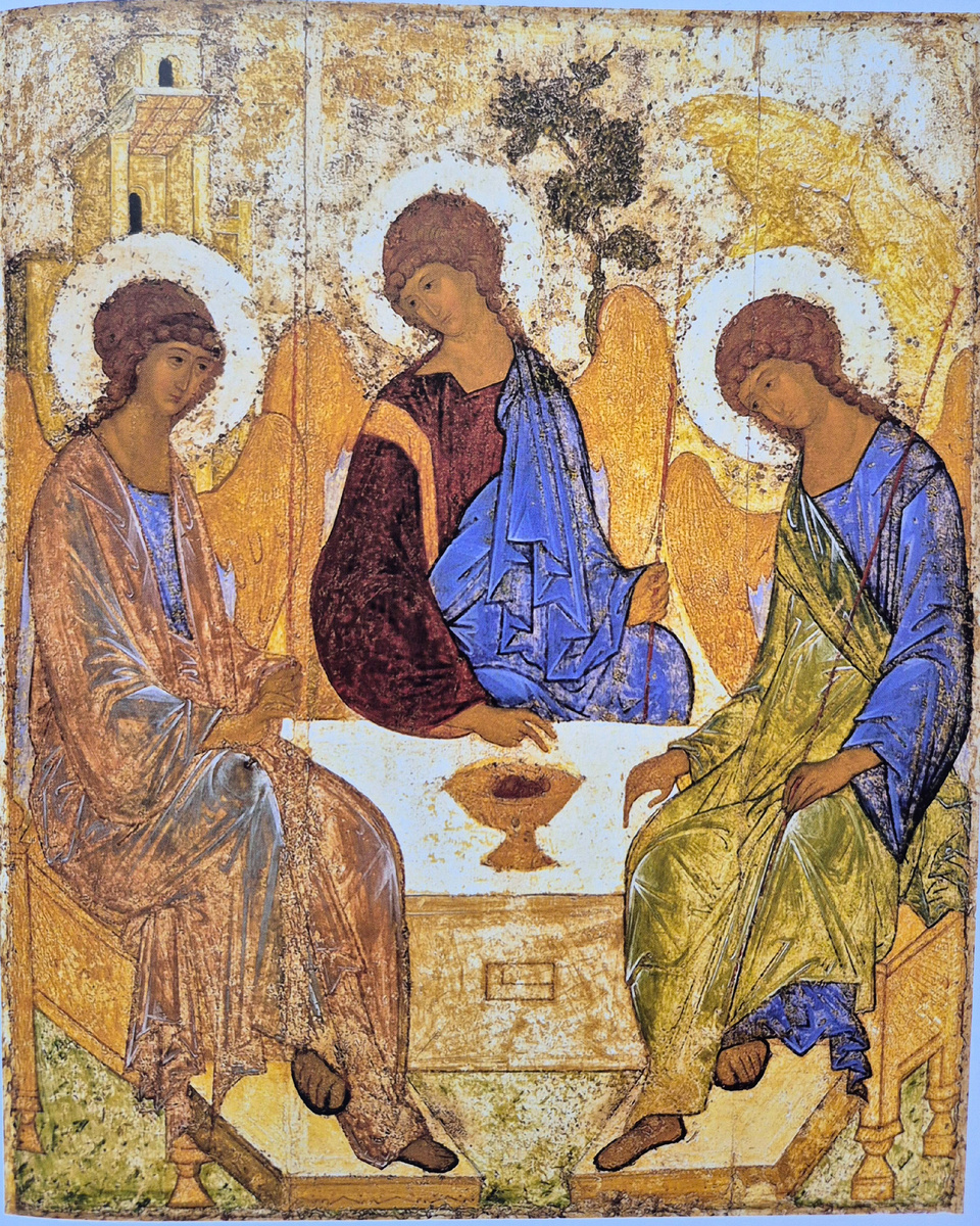 «Троица» Андрея Рублёва — это не просто икона, а целый мир, сотканный из света, гармонии и глубокого духовного смысла. Это шедевр древнерусского искусства, чудом дошедший до наших дней, и одно из немногих произведений, в котором гений иконописца проявился во всей своей полноте. На иконе изображён библейский сюжет, который словно оживает перед глазами зрителя. Праотец Авраам встречает трёх путников, которые оказываются ангелами. Их фигуры, облачённые в сияющие одежды, образуют идеальный треугольник, символизирующий единство и гармонию Святой Троицы. Ангелы сидят за столом, их беседа наполнена таинственным смыслом, который раскрывается в каждом движении, жесте и взгляде. Картина наполнена символами, каждый из которых несёт в себе глубокий смысл. Чаша, стоящая на столе, — это чаша Евхаристии, символ духовного единства и жертвы. Голова тельца, лежащая рядом, напоминает о Крестной жертве Спасителя, о его любви и искуплении. Дерево, возвышающееся над средним ангелом, — это дуб из дубравы