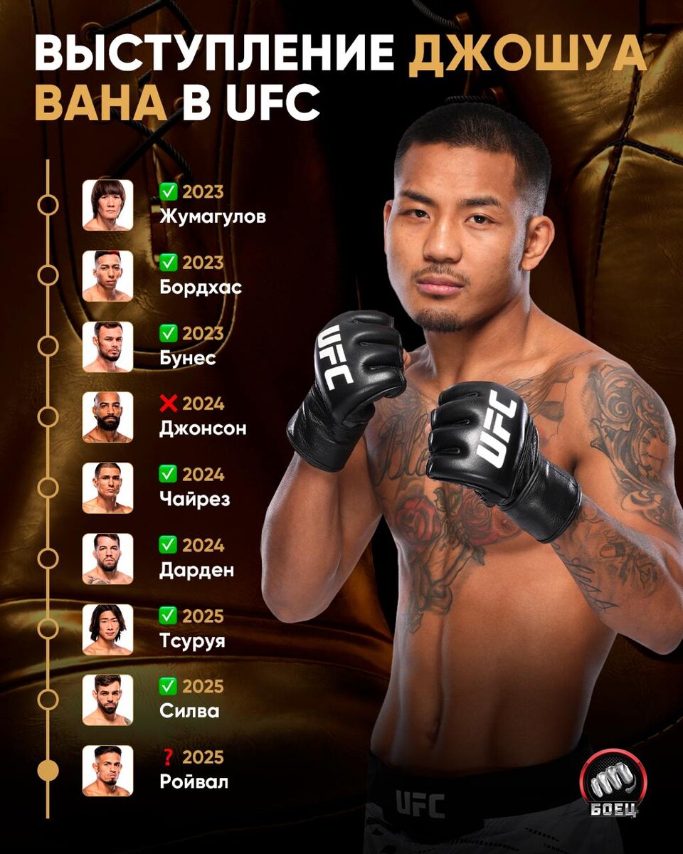 🤔 Ван набрал отличный ход в UFC: ✅ серия из четырех побед; ✅ выходит на девятый бой за два года; ✅ это будет уже третий поединок в 2025 году; ✅ да что там – он будет драться на втором подряд номерном турнире, то есть второй бой за три недели. В прошлом бою Джошуа оформил мощный финиш за минуту до конца поединка. Видео того нокаута можно увидеть в нашей группе ВК 👈 Интересно посмотреть на этого парня в бою с Ройвалом. Ждем UFC 317 😏