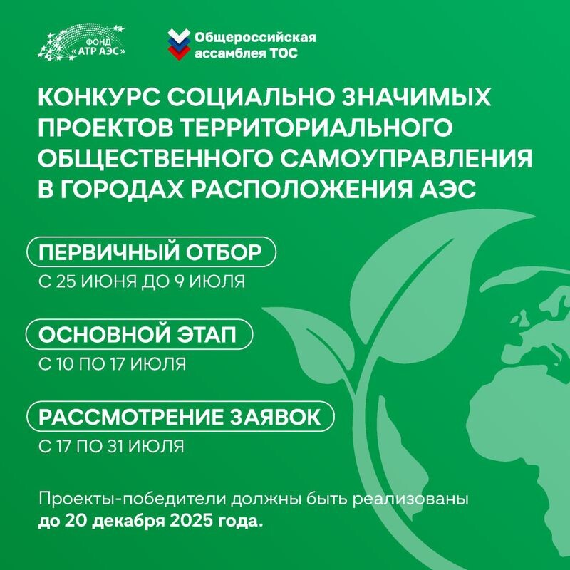 Организаторы конкурса - Ассоциация территорий расположения атомных электростанций и Общероссийская ассамблея развития территорий и общественного самоуправления. Первичный отбор заявок пройдет до 9 июля