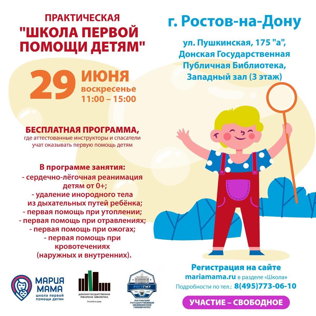 🚨 Мастер-класс по первой помощи детям! 📅 29 июня ⏰ 11:00–15:00 📍 Западный зал ДГПБ, 3 этаж 🎫 Участие бесплатное (регистрация обязательна) 👶 Можно с детьми 6+ Научитесь спасать жизни на практическом мастер-классе от благотворительной организации «Мария мама» при поддержке фонда «Я есть!». Чему научимся? Сердечно-легочная реанимация детям от 0+; Удаление инородного тела из дыхательных путей ребёнка; Первая помощь при утоплении; Первая помощь при отравлениях; Первая помощь при ожогах; Первая помощь при кровотечениях (наружных и внутренних); Что вас ждёт? 🔹 Профессиональные инструкторы с аттестацией 🔹 Специальные манекены-тренажеры, повторяющие строение тела и анатомические особенности человека 🔹 Практические навыки, которые могут спасти жизнь 📌 Регистрация обязательна: 👉 mariamama.ru в разделе «Школа» 🫠 Детские мероприятия Ростов-на-Дону. Я местный!
