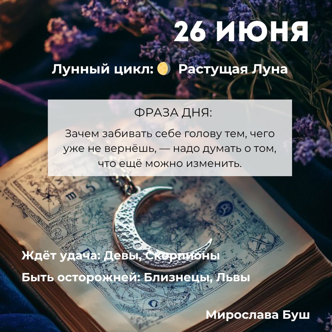 26 июня РЕКОМЕНДАЦИИ: 🌕 Первый день растущей Луны. Всё, что будет заложено в этот день - увеличится. Не умножайте ссоры, а растите изобилие. ⚠️ В мире сейчас ОЧЕНЬ нестабильная энергетика. Негатив буквально висит в воздухе. Отсюда столько конфликтов, войн, смертей. Думаю, вы это и сами заметили. Люди будто сошли с ума. Столько негатива в мире не было очень и очень давно. Будьте осторожны! 🛡 Нужна мощная защита, иначе негатив будет высосет из вас всё самое лучшее. Завтра последний день записи на мои отливки. Поторопитесь, тренд сейчас в мире очень плохой, лучше быть под защитой. Записывайтесь по ссылке ниже: ➡️➡️ ХОЧУ ОТЛИВКУ ⬅️⬅️ ✉️ Подписаться на Мирославу #прогнознадень