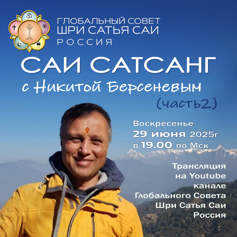 Саи-Сатсанг с Никитой Берсеневым (часть 2) Когда: 29 июня 2025 г. в 19.00 по Мск (воскресенье) Где: трансляция на Youtube канале Глобального Совета Шри Сатья Саи Россия: https://youtube.com/@sssgcrussia Никита Берсенев, Президент Национального Совета ГС Шри Сатья Саи Россия, больше 25 лет изучает учение и личность Сатья Саи Бабы. В своё время, ещё обучаясь в университете, защитил диплом, посвящённый Его учению. Неоднократно с 1995 года посещал Ашрам Прашанти Нилаям в Индии, Ашрамы и центры Шри Сатья Саи Бабы в других странах. На сатсанге Никита продолжит делиться опытом общения с Бхагаваном. Такие рассказы всегда дают соприкоснуться с энергией и любовью Свами ❤️