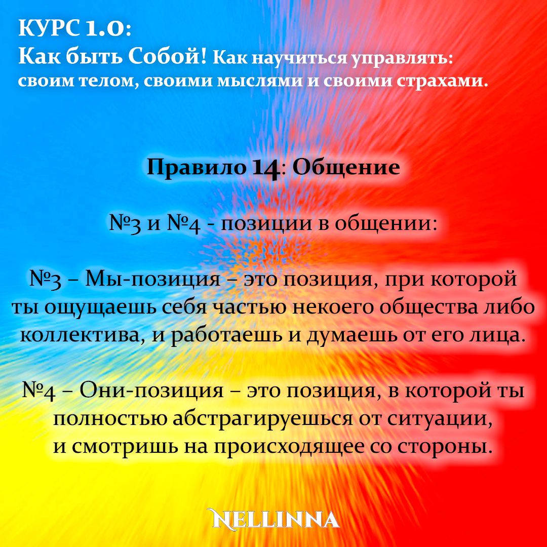 Правило 14: №3 и №4 - позиции в общении: №3 – Мы-позиция – это позиция, при которой ты ощущаешь себя частью некоего общества либо коллектива, и работаешь и думаешь от его лица. №4 – Они-позиция – это позиция, в которой ты полностью абстрагируешься от ситуации, и смотришь на происходящее со стороны. Мы-позиция – действительно поможет продвигаться по карьерной лестнице либо службе. Они-позиция - отличный способ обрести непредвзятое и объективное видение вопроса. Чтобы не пропустить следующую публикацию – Подписывайтесь! И делитесь полезной и бесплатной информацией! #курс #тренинг #обучение #практикум